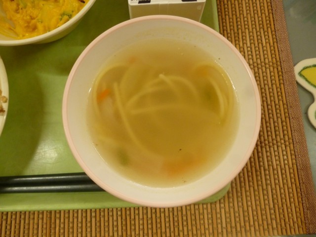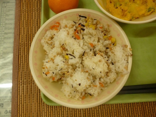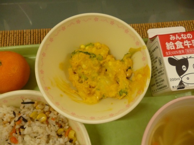 12/9(火)の給食は、群馬クレインサンダーズとのコラボ給食でした。この日の献立は、「サンダピラフ、パワーアップサラダ、チキンヌードルスープ」でした。