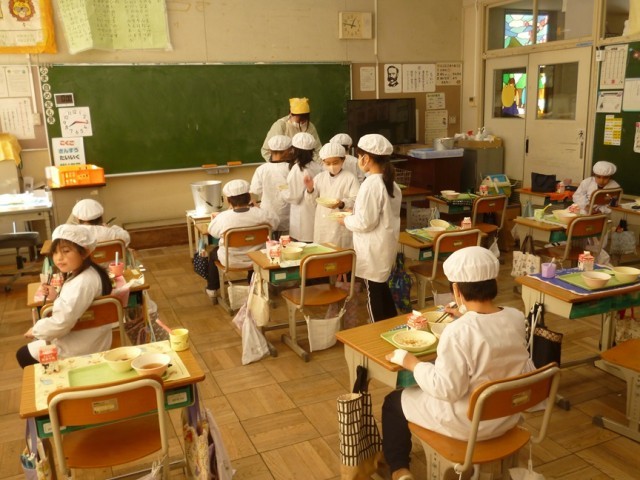 1年生も準備や配膳などの活動を、だいぶ上手に短時間でできるようになりました。おいしそうに給食を食べて、白玉しるこの白玉やちらしをおかわりしていました。