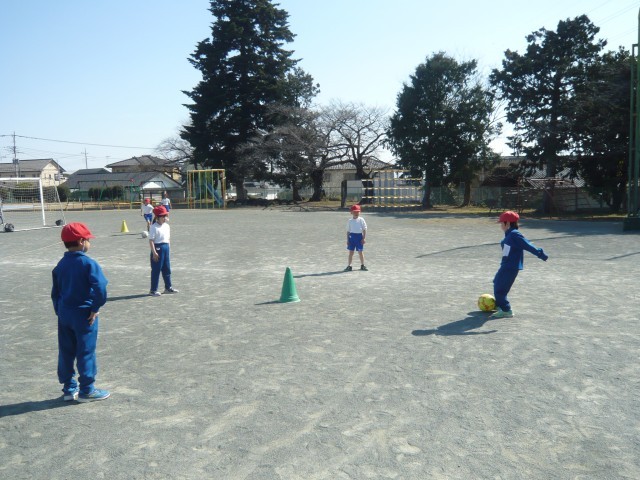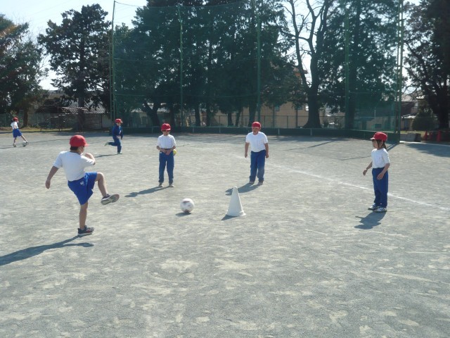 グループで仲良くボールけりの練習です。