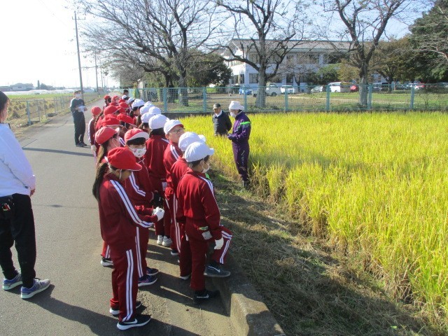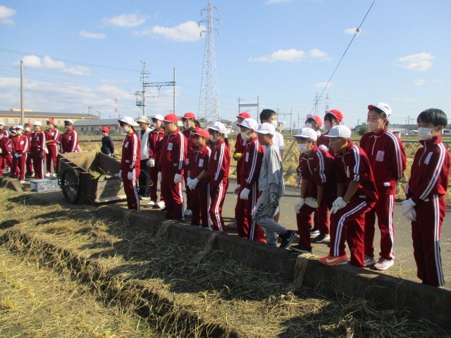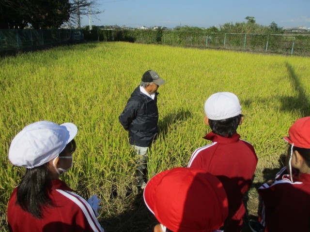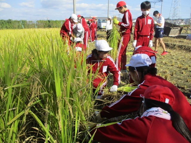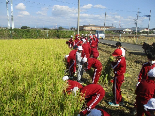 10月24日(金)、秋晴れの中、農業指導員と本校職員の指導の下、稲刈りをしています。1校時4年生、2校時6年生、34校時5年生が担当しています。稲を刈り、麻紐で縛り、干す作業までします。子どもたちは頑張っています。