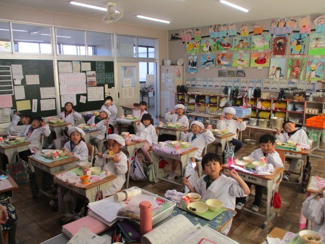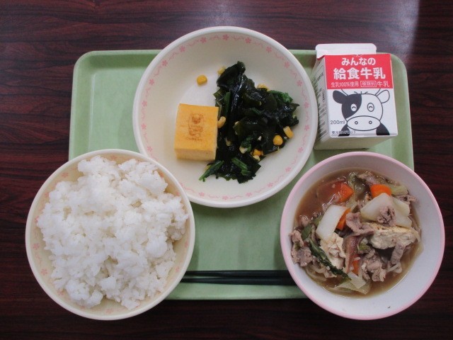 メニュー  ごはん、牛乳、厚焼き卵(ぐんまちゃんがプリントされています)、山吹和え、すき焼き風煮 です。