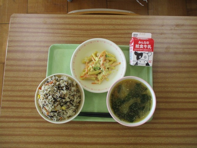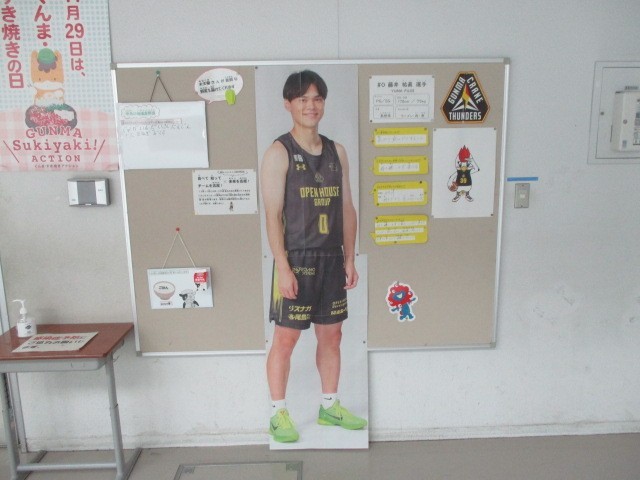 12月17日(水)、本校では群馬クレインサンダーズと太田市のコラボ給食を提供しました。本校では藤井選手の好きな味噌汁を献立の中に盛り込みました。色合いはユニホームの「黒」「黄色」マスコットキャラクターのサンダ君の「赤」と「白」の食材を多めに用いました。