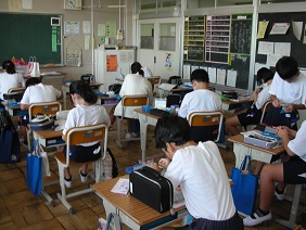家庭科は裁縫です。5年生丁寧で上手です。社会は、水産業です。水揚げされた魚は・・・・。