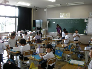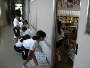 水彩絵の具の勉強です。「いろ水を作ろう」どんな色の水ができたのでしょうか。まわったときは片付けに入っていました。
