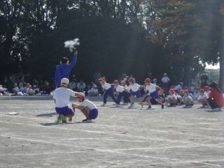徒競走は各学年毎に走りました。1・2年生は50m走、直線を走ります。3年生以上は90m走、コーナーを曲がって走ります。