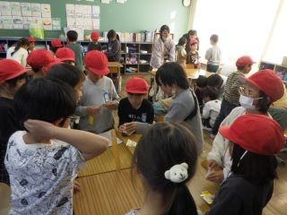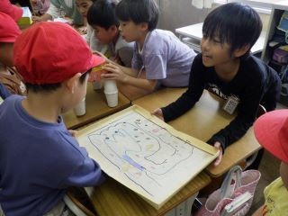 磁石を使った迷路、風で走る車、ぴょんっと跳びはねる紙コップなどなど、やり方を説明してあげる2年生は、優しいお兄さん、お姉さんの顔です。