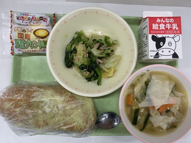 最近食べていないから食べたいとあがった「うぐいす揚げパン」。人気の「小松菜サラダ」と「ワンタンスープ」というメニューで、バランスもよい献立となりました。
