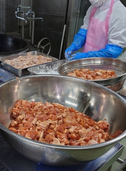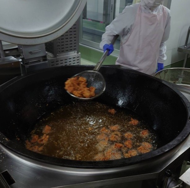 今日は、新しい給食室で初めての手作り唐揚げを作りました。
