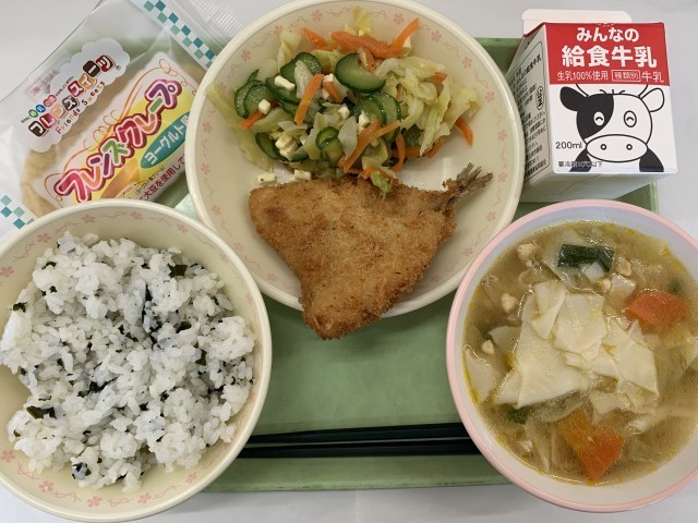 27日の献立:わかめご飯、あじフライ、チーズサラダ、ワンタンスープ、クレープ、牛乳