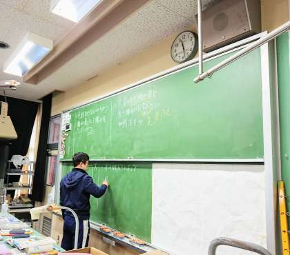 学びをつなごう、の学習です。ひとりの発言をもとにみんなで考えを出しあい、よりよい表現や考えに磨いていく過程の場面です。