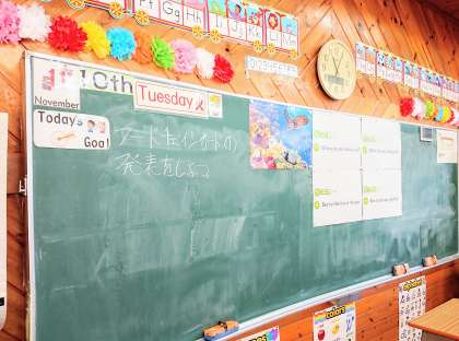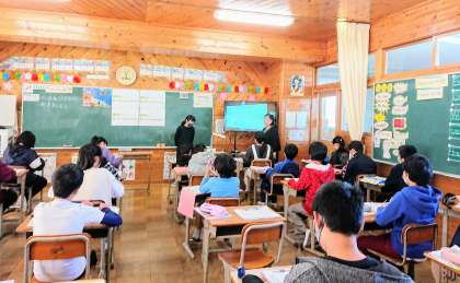 フードチェインカードの発表をしよう、の学習です。ALTの先生と一緒に、前に出てやりとりを順番にしています。動物を選ぶ、暮らしている場所を選ぶ、食べているものを選ぶ、という流れで話しています。