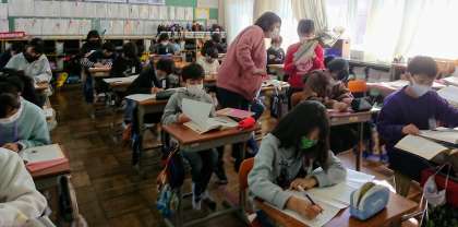 (白神山地からの提言 意見文を書こう)の学習に取り組んでいます。資料から分かることを各自が書き出し、それを黒板の表にみんなでまとめて、学級全体で学ぶ姿勢を大切にしています。(◯◯さん、ありがとう。)という先生の言葉かけがあたたかいです。頑張っている5年生です。