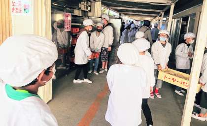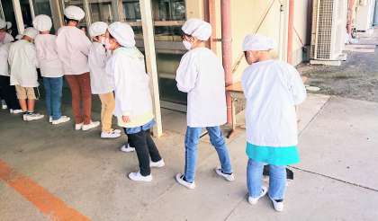 子どもたちが給食当番で列をつくり、給食をいただきに来ます。運ぶ途中で廊下や階段で汁物がこぼれたら、すぐに雑巾で拭く係も同行している学級もあります。後始末も含め、(毎日みんなが気持ちよく暮らす学校)にしたいですね。古い校舎ですが、みんなで気持ちよく過ごすための工夫をしています。