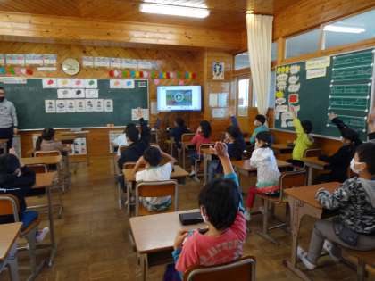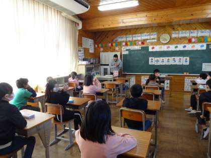 2学期から月に1回程度、外国語活動の授業体験をしています。英語専科の先生に教わっています。今日は色についての学習をしました。普段、聞き慣れない英語で難しいようですが、積極的に話そうと、子ども達は声を出したり、ジェスチャーをいれたりして頑張っていました。時には、リズムに合わせて、楽しく歌いながら学んでいます。色々な子が発表出来るようにサイコロを使って発表する人を決めることもありました。お家でも英語で色についてお話を聞いてみてください。