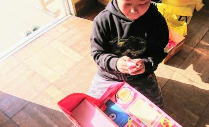 家でのお手伝いを彷彿させる手つきで、お店やさんごっこをしています。楽しい会話もしながら、たくさんの工夫をしてごっこ遊びが充実していきます。笑顔のあるごっこ遊びは素敵ですね。