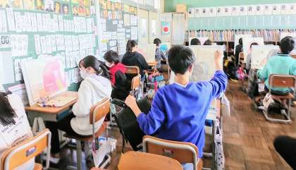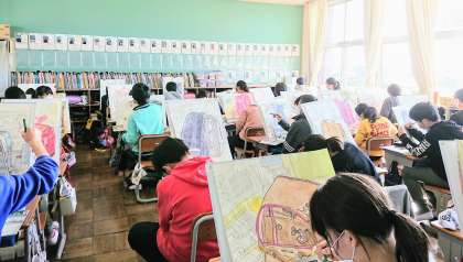 仲間の絵が見える中で、ひとりひとりが描きます。楽しみながらも、集中して作品を仕上げます。