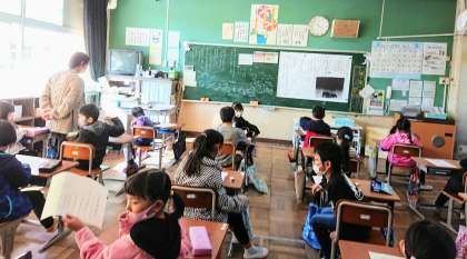 教室の中には、子どもたちの書いた作文がしっかり掲示され、横黒板は校内研修を受けて、日々の学びを支える内容が掲示されています。子どもたちも学習の目当てに向かい、先生が橋渡ししながら、発言をつなげて考えを膨らませたり、別な視点で感じなおしてみたりしています。書く、話すという自分の考えをアウトプットする学習が展開されてきています。