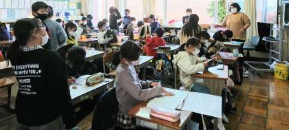 教室で、校外学習の振り返りをし、作文を書いています。荷物の片付けもしています。