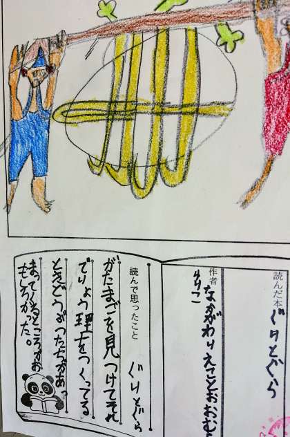 先日、全校児童を対象に、早寝・早起き・朝ごはんや、家庭での読書習慣、家庭での会話、家庭での継続したお手伝いなどの取り組みなどについて、自己評価をしてもらいました。今、集計をしていますが、特に読書習慣の定着については、今後も継続して取り組んでいきたいと思います。学力向上の基盤としても、豊富な読書経験は大切です。ぜひ、各ご家庭で積極的に取り組んでいただければと思います。じわじわと効果が出るのが読書です。写真は2年生の読書カードです。ぐりとぐらが紹介されています。