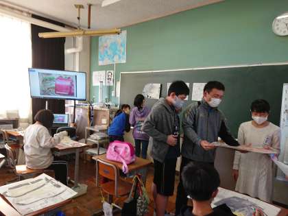 思い出のつまったランドセルを描いています。お互いにアドバイスをしています。卒業前の楽しいひとときです。