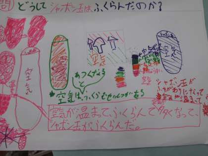 どうしてシャボン玉が膨らんだのか、班で相談して意見を出し合いました。