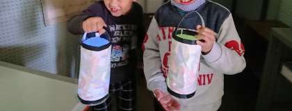 子どもたちが、(校長先生、いいものができたら見てください!)と職員室に来てくれました。薄暗い放送室で眺めると、ほんのり明るいランタンの光が素敵です。たくさん頑張ったランタンに満足感がもてたので、よほど嬉しかったのでしょうね。笑顔、笑顔です!子どもたち、よく頑張っているね!職員室も笑顔、笑顔になりました。ありがとう。