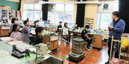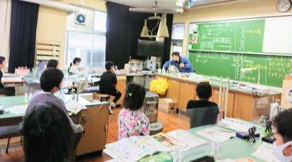 (空気の体積は、温度を変えるとどうなるかを調べよう)の実験の手順を確認しています。てきぱきと子どもたちは、先生の手順な指示を確認していました。学級みんなで頑張っています。