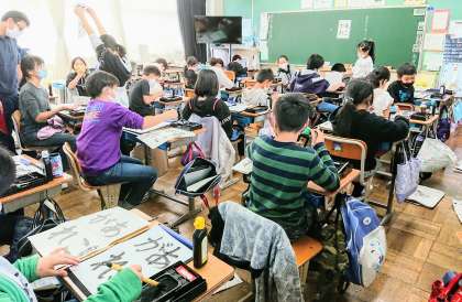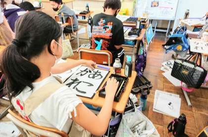 (あこがれ)を書いています。ひらがなは難しいな、とつぶやきながら、書いている子もいました。一文字は気に入らず、一文字はとてもよく書けたと悩みながら、どの子も良く練習しています。