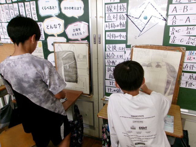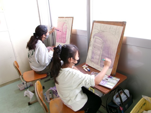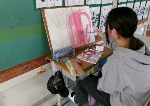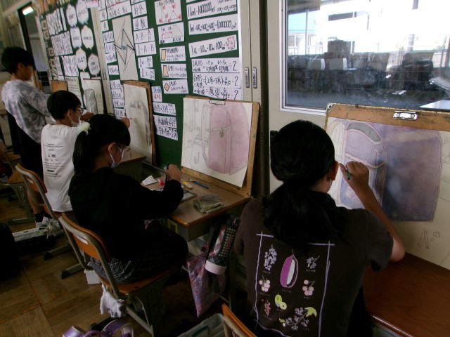 図工では、「私の大切な風景」として6年間使ったランドセルと教室の風景画に取り組んでいます。使い込んだランドセルのしわや汚れなどもじっくりと観察し、小学校最後に過ごした教室や窓から見える景色も描いています。遠近感や光の陰影も色で表現していきます。できあがりが楽しみですね。
