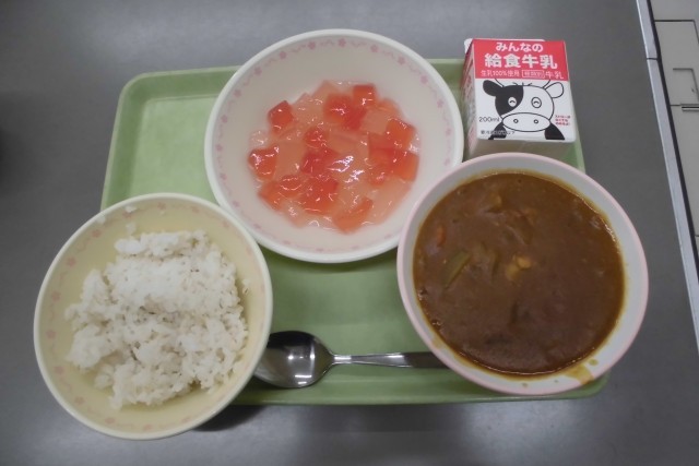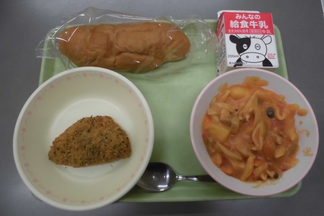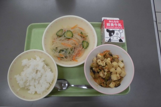 今週の他の給食もご紹介します。昨日23日(木)むぎごはん、牛乳、豆カレー、ゼリーあえ、 22日(水) ロールパン、牛乳、あじ香草フライ、チキンのトマトクリーム煮  21日(火)ごはん、牛乳、麻婆豆腐、はるさめサラダ