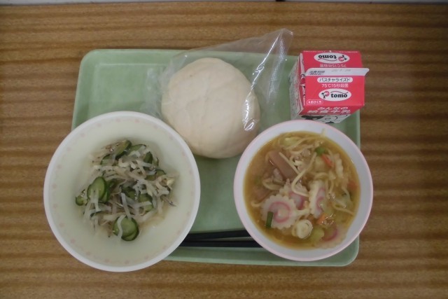今日の給食の献立は6年1組のリクエスト献立です。メロンパン・牛乳・ぐだくさんしょうゆラーメン・めんじゃこサラダ。家庭科で学習したことを基礎においしくて栄養バランスのとれた献立で、とてもおいしかったです。全校児童に大人気でした。ごちそうさまでした♪
