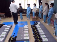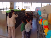 1年生が靴入れの使い方を学んでいました。二階建ての1階に外靴、2階に上靴を入れる...