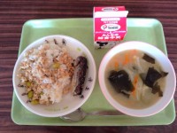今年度初の給食の献立はそぼろごはんいわしのみぞれ煮じゃがいもとわかめのみそ汁、そ...