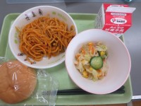 今日の献立は五目うどんもやし炒めバンズパンそして牛乳です。甘いバンズパンは子ども...