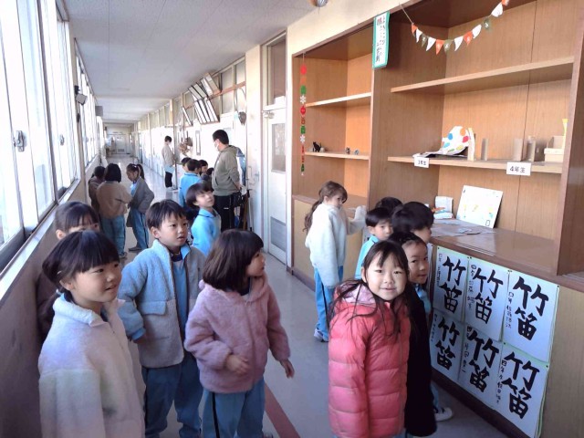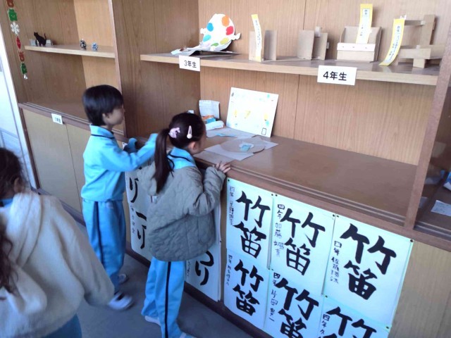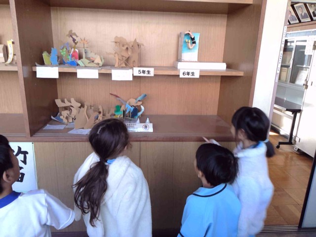 校長室前の展示棚を見ていました。