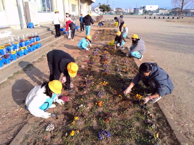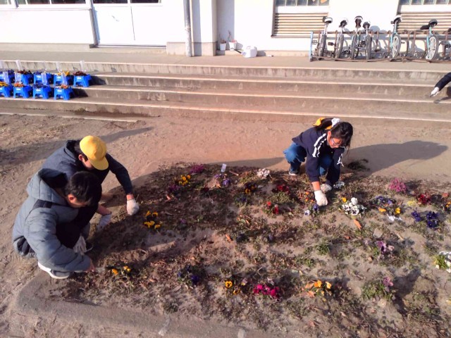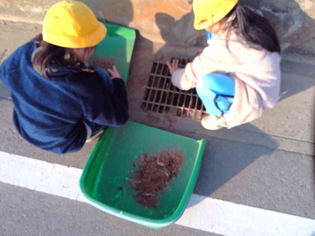 学校南側の道にある砂や落ち葉などを一生懸命に集めていました。