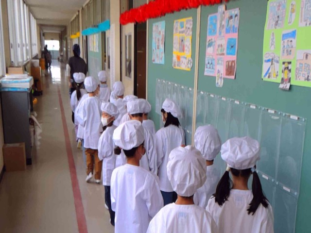 それを静かに教室から見送る子どもたち。