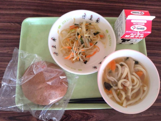 おいしい給食 公開日 2026/04/16 更新日 2026/04/16 給食 今日の献立は五目うどんもやし炒めバンズパンそして牛乳です。甘いバンズパンは子どもの人気メニューです!五目うどんは野菜たっぷり!今日もおいしくいただきました。ごちそうさまでした。