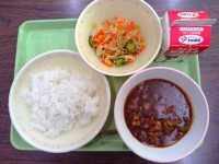 カレーの日である今日の献立はカレーうどんフライビーンズみかんロールパンそして牛乳...