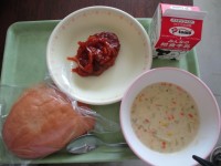 今日のメニューはガーリックライスチキンナゲットミートボールスープそして牛乳です。...
