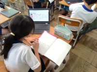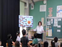 英語室では4年生がアメリカ(?)の小学生のバックの中身から文化の違いの学びをして...
