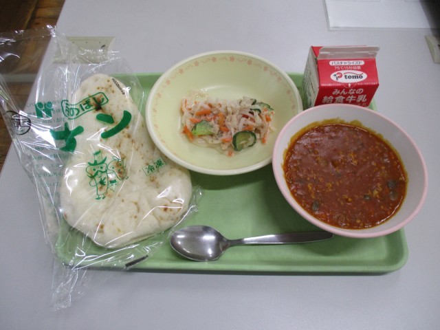 今日の献立はキーマカレー大根サラダナンそして牛乳です。ナンは1年2組のリクエスト...