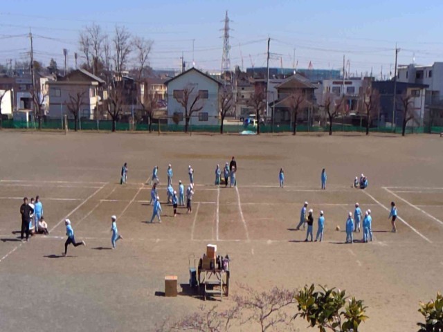 春の日差しの中、5年生と2年生が校庭で体育をしていました。5年生は短距離のタイム...