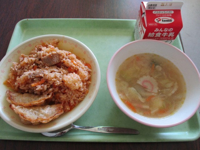 今日の献立はキムタクごはん揚げ餃子中華スープそして牛乳です。今日のメニューは「お...