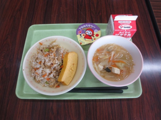 今日の献立は厚焼き玉子野菜たっぷりみそ汁アセロラゼリーこぎつねごはんそして牛乳で...
