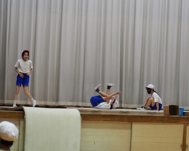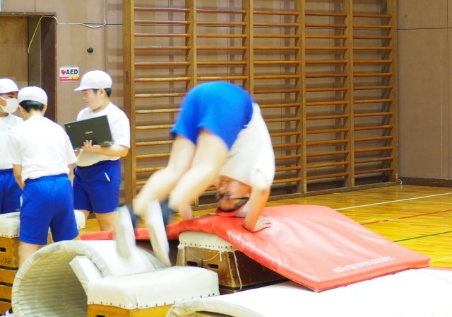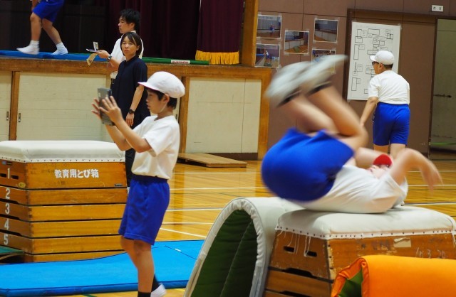 今日は台上前転を勉強しました。子どもたちの技能差に応じて、様々な場が用意され、子どもたちは台上前転ができるように技の練習をしていました。