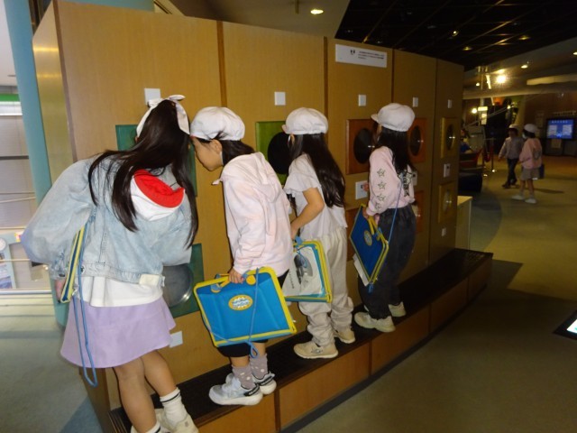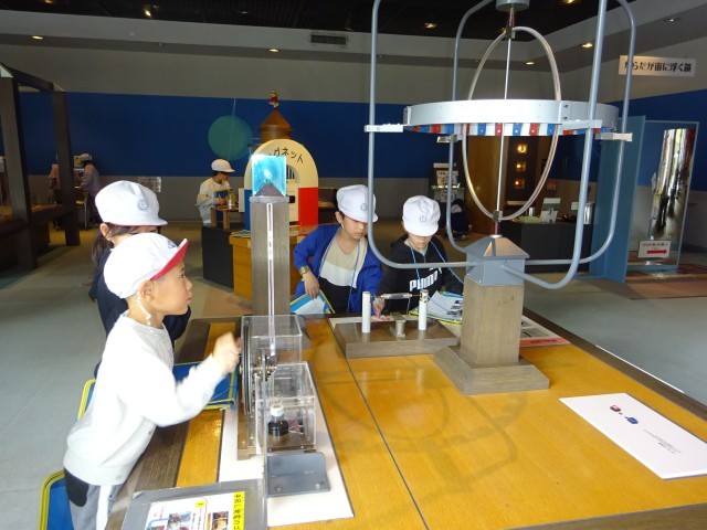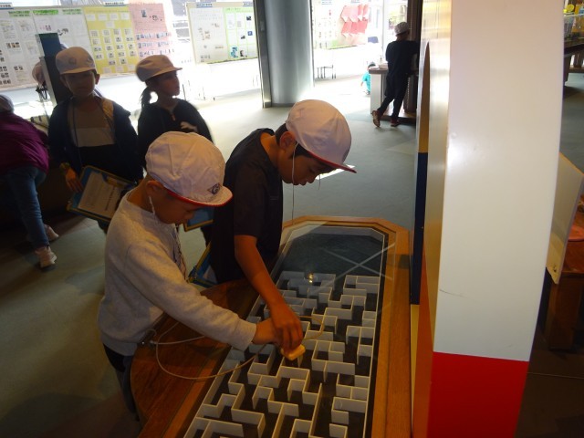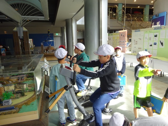 館内での子ども達は、自転車を漕いで発電して模型バスの動力にしたり、不思議な鏡に写る姿に夢中になったり、友達と相談しながらパズルに熱中したり目をキラキラさせて展示を満喫していました。