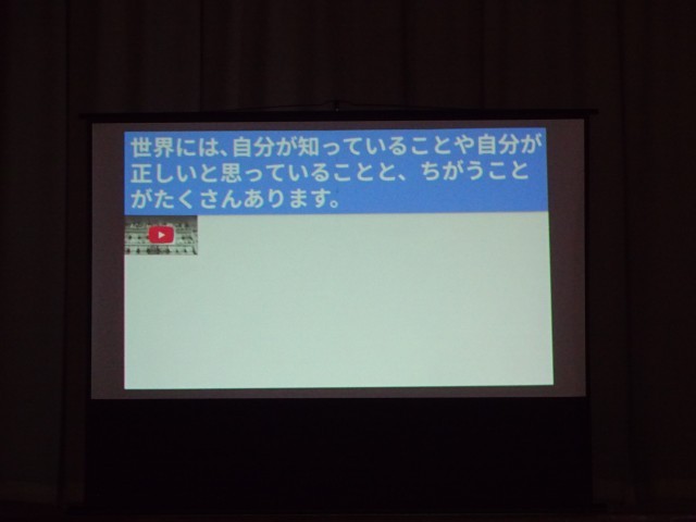 「校長先生がはいたら、おかしいと思うものは?」などいくつかの質問への子ども達の回答を例に、世界には、『自分が知っていることや自分が正しいと思っていることと違うこと=偏見』がたくさんあることを教えていただきました。