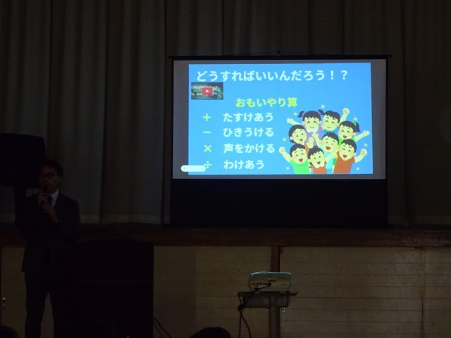 そして、“+:たすけあう -:ひきうける ×:声をかける ÷:わけあうの思いやり算”を心がけて行動する大切さを全校で学びました。