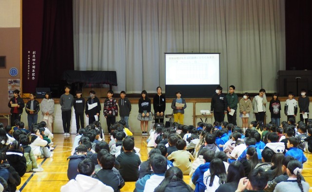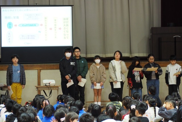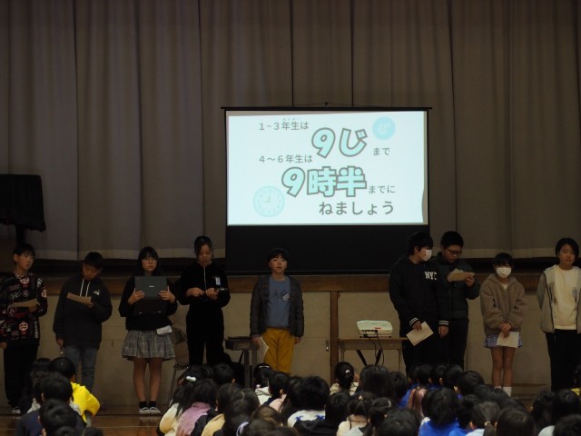 本日の児童集会では保健委員会が2学期取り組んできた睡眠と生活記録について発表しました。